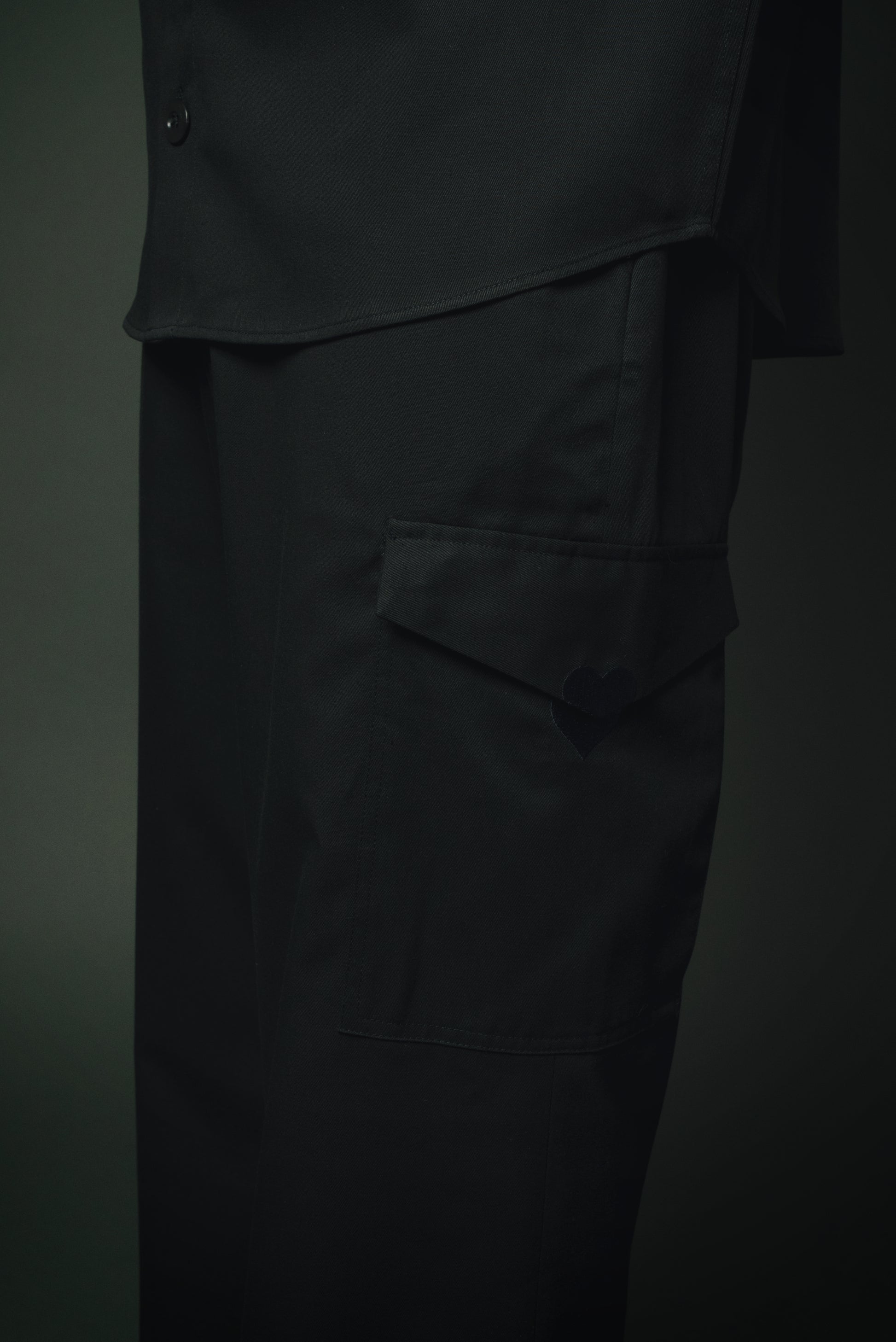 カーゴパンツにあしらわれた特徴的なポケットは、ラブレターをモチーフにしたデザイン。黒素材に黒のハート刺繍を施し、さりげない愛を表現。