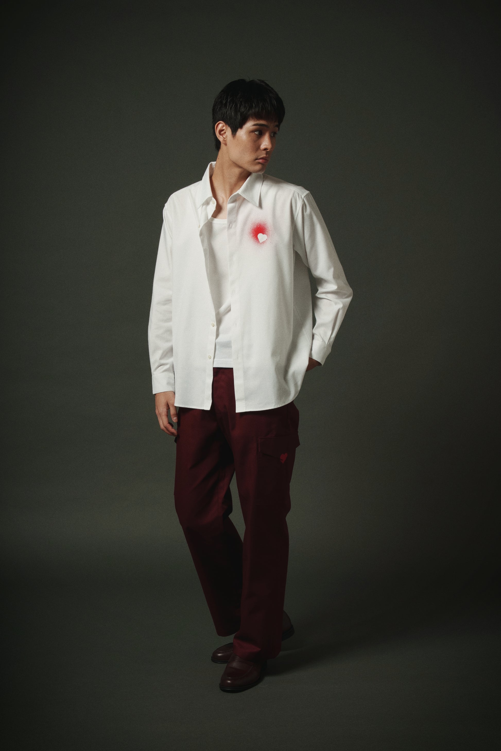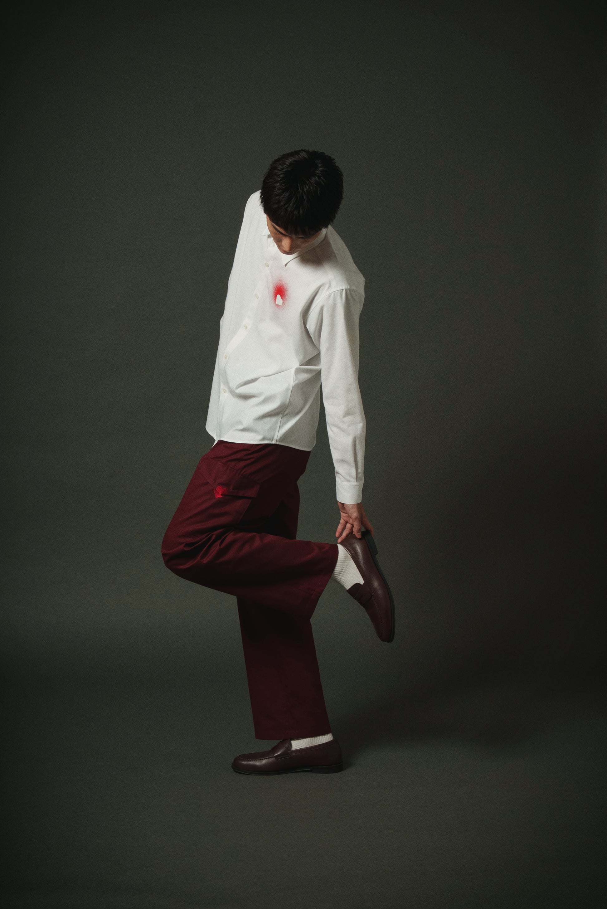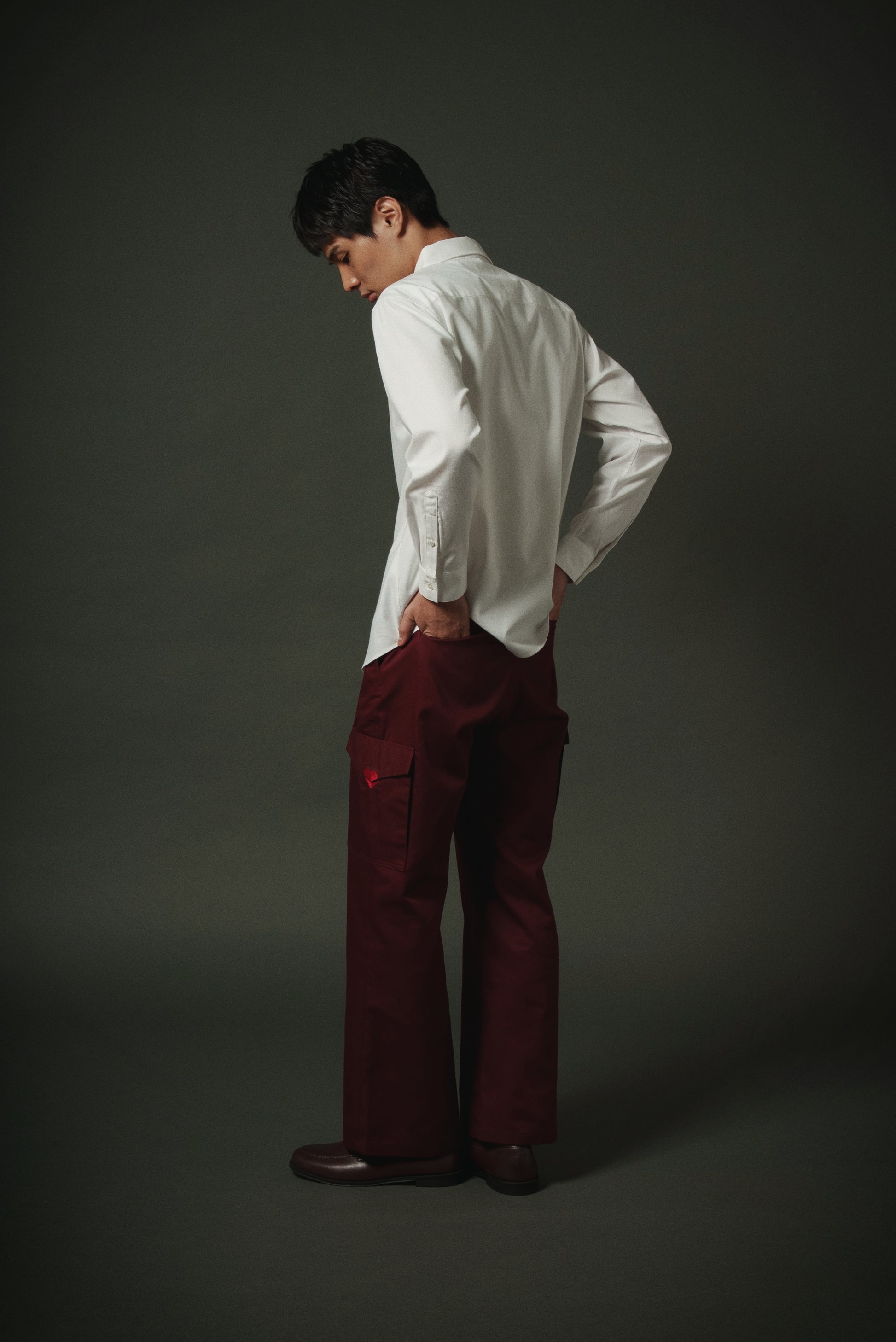カーゴパンツにあしらわれた特徴的なポケットは、ラブレターをモチーフにしたデザイン。